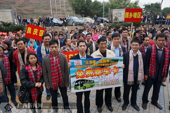 广西新闻网南宁2月1日讯(记者邓昶)2月1日上午,由共青团广西区委、自治区人力资源和社会保障厅、自治区交通运输厅共同主办,共青团南宁市委承办,广西运德车运输集团有限公司协办的2013年 “让温暖一起回家”广西服务万名外出优秀务工青年表彰暨春节返乡欢送仪式在南宁市琅东客运站举行。自治区副主席陈章良出席欢送仪式。近300名务工青年代表到现场参加活动。