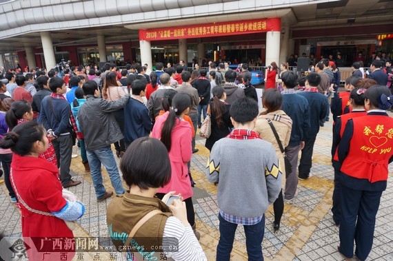 来着各行各业的优秀外出务工青年代表今天上午在南宁市埌东汽车客运中心参加了活动。广西新闻网记者 邓昶摄