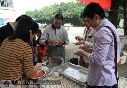 志愿者们买皮、制馅,与社区居民一起包饺子。广西新闻网通讯员 杨立供图