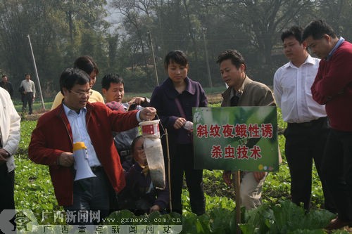 图为覃保荣同志布置甘蔗螟虫性诱试验。