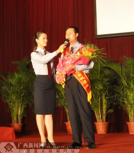 图为蒙为杰在2010感动广西国税百色报告会上掠影。