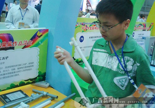 16号展品,解志宇和他发明的模块化多动能工兵铲。广西新闻网记者 刘清 摄