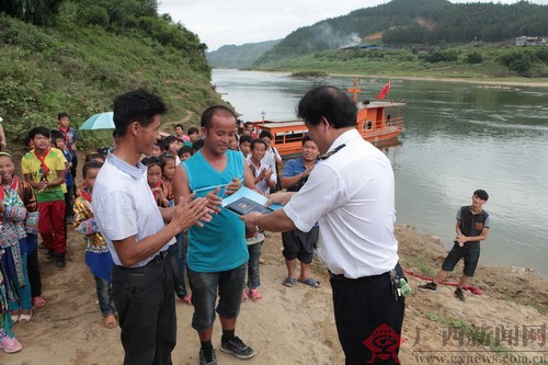 柳州海事局林文南局长向三江县福禄乡仁里村转交船舶所用权等证书。广西新闻网通讯员 覃海 摄
