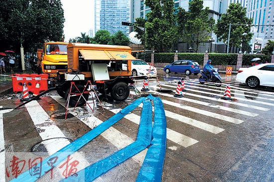 青环路出现积水路段。记者 徐冰摄 金湖金浦路口停放着多台排水设备随时准备排涝。记者 罗暘摄 当日下午4时30分许,南国早报记者在此前多次发生严重积水的金湖金浦路口看到,路口周边停放着多辆发电车和市政排水车,多名市政抢险人员站在旁边,密切关注着积水情况。一口污水检查井的井盖已被掀开,井内水位距离井口约20厘米,抢险人员在周围设置了反光锥筒和警戒线。3台潜水泵已被放进污水井里,水管与旁边的排水车相连。南宁市政工程管理处生产科副科长韦益介绍,6月30日下午,他们就已安排人员对市区内的易涝点进行检查。以金湖广场为例,周围排水管中的积水已被提前排空,提高排涝能力。2日上午,抢险人员就带着抢险设备到金湖金浦路口值守,一旦积水漫出井盖,马上开启排水设备。 下午5时,记者经南宁大桥前往五象大道,明显感觉雨势比金湖广场要大。在广西体育中心前,慢车道已被浑浊的积水淹没。两名抢险人员掀开了慢车道上一口雨水检查井和一口污水检查井的井盖,并在进出慢车道的路口设置了警示带和绕行标志。积水呈漩涡状流入井内,雨水井里已安装了防坠网,一些饮料瓶、塑料袋等杂物都被“兜”在网上。 南宁市城市管理局相关部门负责人介绍,当日下午,城管部门共受理路面积水、道路塌陷等案件超过20起。积水较严重的路段均集中在市区东部,其中五象大道体育中心前路段积水长约200米、最深处约25厘米;邕宁区彩虹南路浦津路口、银峰路北段、八尺江路东段积水超过10厘米。积水原因主要是市区东部短时降雨量较大,同时部分排水管道老旧,并有泥沙、垃圾等杂物堵塞。至当天下午6时许,各积水点积水已基本消退。目前,市政部门正加紧给其他路段雨水井加装防坠网,截至7月1日,共完成1105口雨水井的防坠网安装工作。 【详细】
