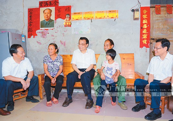 中共中央政治局常委、国务院总理李克强在广西考察时强调 坚持稳中求进 继续稳中有为 使民生改善 7月8日下午,中共中央政治局常委、国务院总理李克强在自治区党委书记、自治区人大常委会主任彭清华,自治区主席陈武的陪同下来到钦州港码头,了解货物吞吐、港口空箱情况,实地感受经济的“冷暖变化”。记者 刘宇 摄 7月9日上午,李克强来到南宁市坛良村看望贫困户黄家明,关切地询问低保、养老、医保等情况。李克强叮嘱当地干部,一定要关心好贫困户的生活,特别是贫困家庭子女的教育问题。记者 刘宇 摄 广西新闻网-广西日报南宁讯 (记者黎攀)盛夏七月,热情似火;八桂大地,生机勃勃。7月8日至10日,中共中央政治局常委、国务院总理李克强,在自治区党委书记、自治区人大常委会主任彭清华,自治区主席陈武的陪同下,深入北海、钦州、南宁三市,围绕经济运行、改革开放、民生改善等开展考察调研。 港口是感知经济冷暖的“温度计”。钦州保税港区在开发建设中创造了“钦州速度”;广西北部湾港实行“三港合一”迈入发展快车道,正逐步成为面向中国-东盟区域性国际航运枢纽和港口物流中心……耳闻目睹北部湾的喜人变化,李克强深感欣慰。得知今年北部湾港的集装箱吞吐量有望突破100万标箱,李克强提出更高要求,给大家加油鼓劲:“你们要有成为超千万标箱大港的信心!”随后,他冒雨来到钦州港码头,了解港口空箱、货物吞吐等的变化。听工人讲今年比去年忙,他高兴地说,大家忙,说明港口兴旺、收入增加、经济发展。李克强说,广西是中西部地区唯一有沿海大港的省区,现在产业由东向西转移加快,要顺应这一趋势,扩大向西向南开放,以开放促发展,打造我国西南和中南部新的战略支点,更有力地辐射、带动腹地发展,促进结构优化,提高增长的质量和效益。“该到广西腾跃的时候了!”李克强对广西发展寄予厚望。 稳增长、促升级重在稳就业。在北海,李克强考察了冠德公司,听到企业积极应对国际市场变化,保持了就业的稳定,李克强表示赞许。在钦州,李克强召开了小微企业座谈会,询问企业对下半年市场的预期和对国家政策的建议,他说,小微企业“铺天盖地”,是就业的最大吸纳器,政府会继续从政策上给予支持,创造良好环境。千千万万的小微企业发展好了,就会为增长和转型装上更多“助推器”,打开更广阔的就业大门。 广西是全国甘蔗和水稻的重要产地。在南宁市坛良村,李克强冒雨攀上湿滑的甘蔗地,正在劳作的村民告诉总理,今年甘蔗长势旺,收入会比去年多。李克强说,日常生活尤其是儿童长身体需要糖,群众过上“甜日子”离不开你们,国家会通过多种方式,帮助你们多增收。目前水稻收获在即,李克强沿着泥泞的田埂走进稻田,了解田间管理、农业技术服务和收获保管等情况,祝乡亲们增产又增收。山路上,稻田边,李克强特意回过头叮嘱村民:“路滑,你们要小心。”