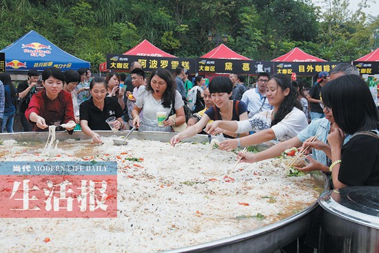 广西新闻网-当代生活报讯(见习记者 李望舒 叶丽萍 叶佳倩/文 记者 徐天保/图)10月1日下午,广西电视台《老友一家亲》剧组携手绿野音乐节共同打造的“万人品天下第一大碗老友粉”在李宁体育园内火热开锅。不少“老友”慕名而来,在热闹的音乐声中,一尝这碗老友粉。老友粉、老友面是南宁的标志性小吃,不少南宁人都有“老友”情结。