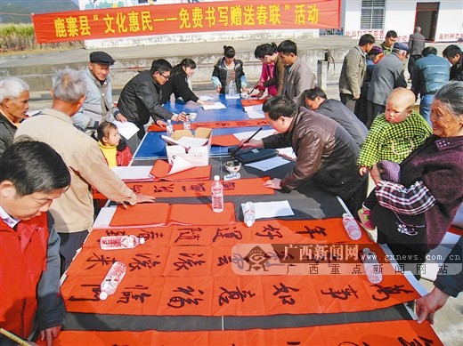 1月18日,鹿寨县文明办、文联组织一批书法爱好者到平山镇石豆屯为群众免费书写春联。当天共赠送春联800多副。作为“全国文化先进县”、“中国楹联创作基地”,该县坚持10余年组织开展为群众书写、赠送春联活动。赖建辉/摄