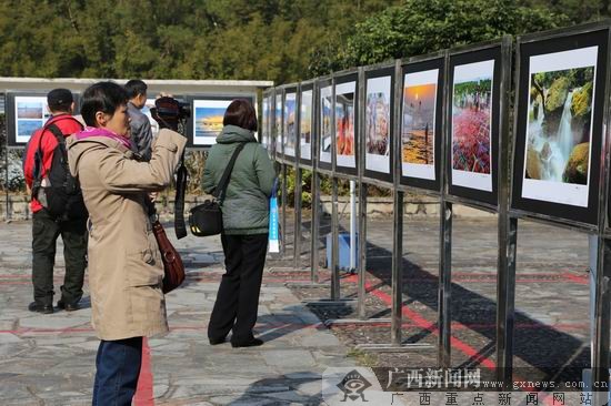摄影爱好者在摄影大赛开拍仪式现场欣赏摄影作品展。广西新闻网记者陈琳燕 摄