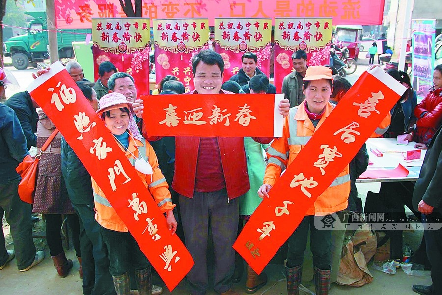 1月21日,南宁市兴宁区组织辖区书画家们走进三塘镇四塘街,为当地群众免费书写春联。 记者 杨素颜 通讯员 郭建锋/摄