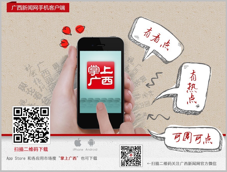 第一步:请网友在手机中下载“掌上广西”或者“掌上红豆”的手机客户端,快捷安装(二维码)如下: