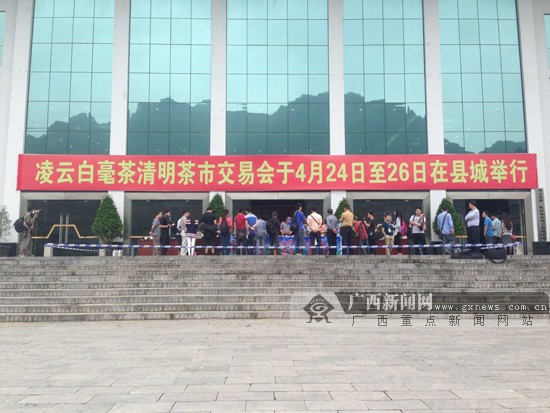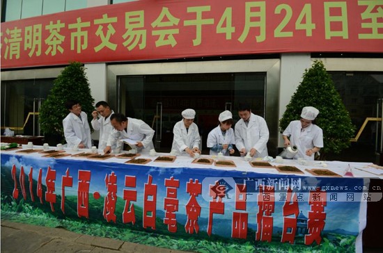 广西新闻网凌云4月24日讯 (记者 胡雁) 云岭生香飘万里,茶山绽蕊醉千家。4月24日,广西凌云白毫茶擂台赛在凌云县会议中心一楼大厅举行,本次擂台赛是通过茶样展示、品茶、评茶等程序,评比出各类茶叶等级、品次的擂主“白毫王”。广西凌云县白毫茶已于2005年正式获得国家地理标志称号,白毫茶是我国目前唯一能生产加工绿茶、红茶、黄茶、白茶和乌龙茶等六大茶叶产品的茶树品种。