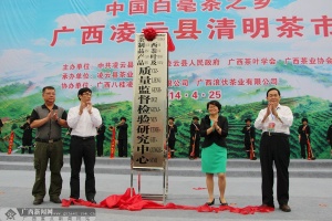 广西新闻网凌云4月26日讯(记者胡雁 杨郑宝 通讯员杨通站)25日,广西凌云白毫茶清明茶市开市仪式在凌云县茶产业园举行,茶叶相关权威部门为广西茶叶质检中心揭牌,还为在广西凌云白毫茶擂台赛中获得“白毫王”的擂主及凌云县2013年茶产业优秀企业颁奖。