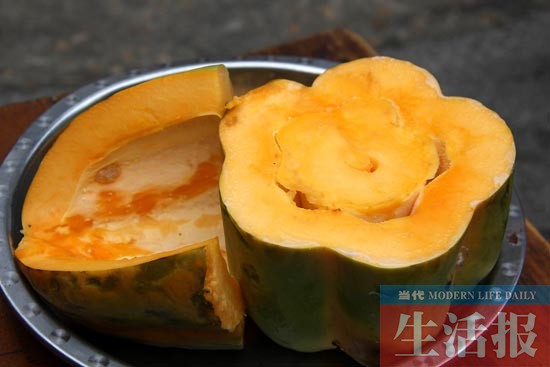 记者在黄先生家看到,他切开的木瓜横截面呈梅花状,而本该空心的内部,却满满当当地长着一块同为梅花状的果肉,一眼看上去就像一个无皮的小木瓜(如图)。