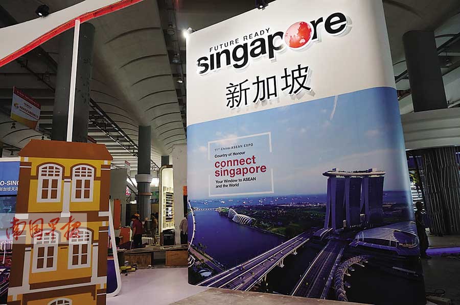 新加坡展馆。 新加坡·新加坡城 走进展馆如行在海边 “高大上”的新加坡是今年的主题国,他们在“魅力之城”的展馆布置上,也花了不少心思。 整个新加坡馆都以海洋文化为主题,馆体设计犹如晃动的海浪。在该馆左侧,一个精致的沙盘正在安装。从效果图看,这里将成为一处集中体现新加坡现代城市风貌的展示区。再往里走,巨大的狮头鱼身像、灯塔、邮轮的组合展板,无一不在告诉观众,这是一个三面环海的海洋国家,也是一个海上航运发达的国家。 因为现场所有的灯光都被设计成轻柔晃动的光线,行走在该馆之中,有一种行走在海边的感受。 在展馆后方,新加坡自信地打出了“您了解东盟和世界的窗口”口号。