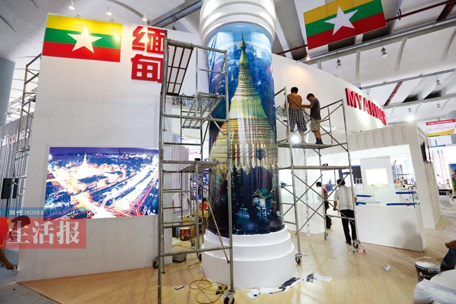 缅甸展馆 缅甸·仰光 圆柱展现城市特色 今年缅甸仰光展区最吸引人的是展区的两根圆柱,其中一根柱子上有一望无际的大海和船,另外一根柱子上则是缅甸仰光著名的大金寺。记者在设计图上看到整个设计也是呈现“船型”。仰光是一座具有热带风光的美丽的海滨城市。市内的民间建筑具有传统的缅甸风格,同时也有不少西式建筑。