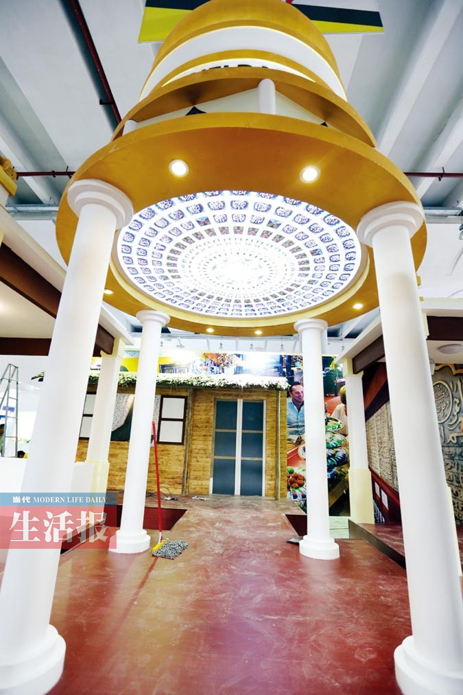 文莱展馆 文莱·斯里巴加湾 现场制作手工篮子和吉祥书画 说起文莱,你是否想起去年该国“魅力之城”的水上村落?告诉你,今年这样的风景你还能在文莱的“魅力之城”斯里巴加湾观赏到。 该展位共90平方米,展位不算大,却浓缩了许多文莱当地的风土人情。例如一进门就能看到的金黄色圆顶建筑,这是仿造文莱最大的皇家清真寺——博而基亚清真寺做的。在它的身后,是一间充满文莱风情的小屋。屋子用干树叶搭盖,小屋的窗户配上碎花窗帘,门前搭配注有清水的沟槽,“东方威尼斯”的风情尽显。 现场一位来自文莱的负责人告诉记者,东博会期间,将有人在该展位上展示手工编篮,还有寓意吉祥美好的书法绘画作品现场制作。