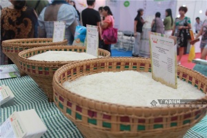 在展馆内与珠宝首饰一起“重磅”推出的是产自柬埔寨的大米。柬埔寨是传统农业国,大米成为其主要对外销售的产品。据大米销售商介绍,他们的大米特别之处在于土地一年只产一次稻。在收割稻谷后,要把土地空置大概半年,让土地得到休养生息,所以来年产出的大米营养特别丰富,口感也非常好。