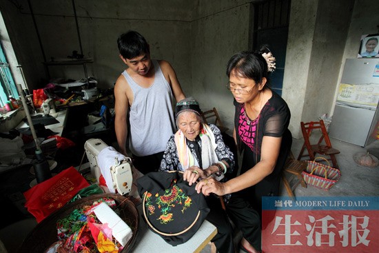 99岁的卢伳英在和孙子孙女探讨刺绣