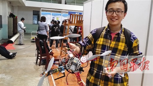 创新创业成果展示会上,“无人机航拍器”的设计团队成员在展示小伙伴们的作品。这些作品都是由广西大学的学生自行设计制造的。 记者 孙妮摄