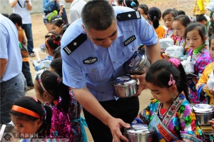 2013年5月18日,莫小华惦记着三江县富禄乡归述村归述小学的学生们,提前给那里的孩子们送去“六一”儿童节的礼物。莫小华了解到,自从国家实行贫困地区儿童“免费午餐”计划以来,柳州市三江县富禄乡归述村的孩子们都在学校吃上了免费午餐,虽然饭菜解决了,可供孩子们用来吃饭的碗却很少,孩子们得排着队等碗吃饭。爱心交警莫小华此次前往归述村归述小学,不仅给孩子们送去了6000元的学习用具和体育用品,还带去了300个不锈钢饭盒,让孩子们用上自己的专属饭盒更卫生的吃饭、更放心地学习。