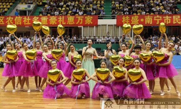 南宁农信副主任廖鸿敏(左一)为现场观众抽奖。广西新闻网记者韩定宏摄
