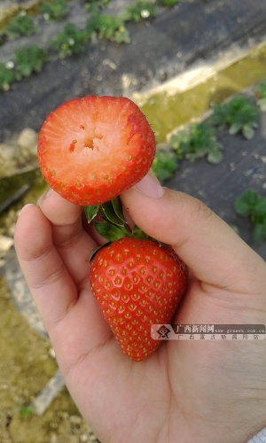 广西胤龍生态农业开发有限公司董事长陈桂漳向记者介绍,这里种植的草莓品种都是甜查理,是在北京育好的一代苗,品种优良,所使用的肥料都是有机肥,而且几乎不用喷药,地里成熟的草莓都是无公害无残留的。草莓不但个大,颜色鲜艳,草莓味浓郁,品相干净,摘下来就可以直接吃,采摘期大约为3个月左右。同时,园内还种植了45000盆草莓盆栽,一月底将向游客出售,游客可将盆栽放置在家中,春节前后盆栽草莓也将成熟,鲜红的色泽也为家中增添一份喜庆的色彩。