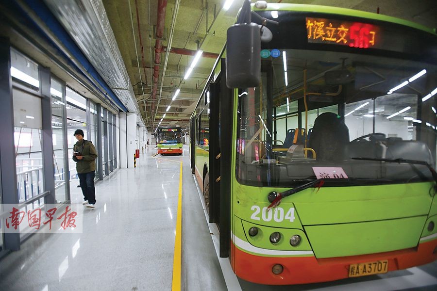 2月6日起,南宁东站所有的出租车和部分公交线路转入北广场负一层上客,旅客无需出站就能换乘。图为2月5日演练时的场景。记者 徐冰摄 体验:地下换乘指示清晰 候车转入地下后,对乘客而言是否方便?5日上午,记者按旅客出站流程进行了体验。 旅客走出动车后,在高铁站台、出站通道等处便可看到公交、出租汽车导乘标识和公交线路牌等。新启用的公交、出租车场位于北广场地下,从高铁站台下到负1楼的出站集散厅后,沿着南北通道一直往北广场方向走便可。 行至集散厅通道最北端,记者看到,两边的大柱子上各贴有一张大幅公交线路牌,标明东站13条公交线路的途经站点,以及其是在地上还是地下上客:如果你要坐的公交线路是在地上上客,可在这里乘扶梯直达北广场地面;如果你要打的或者要坐的公交路线在地下上客,则继续往前直走,进入与东站出站层连通的北广场负2层换乘大厅。正前方左右两边各有一个扶梯,引导标牌显示,公交车在左,出租车在右,按标牌沿扶梯上去,便分别到达北广场负一层的公交车场和出租车场。 公交车的候车区为“U”型,地下上客的7条公交线路,每条对应一个站台,旅客按线路名去相应站台排队即可。 出租车的候车区分为4个安全岛,各对应1条用金属栏杆围着的候车通道,每条通道开有两个上客口。旅客选择一条通道,便可排队上车。 记者体验感受:出租车和部分公交转入地下候客后,对旅客而言,不用出站就可以实现换乘,非常便捷,也不再有日晒雨淋的烦忧,出租车和公交车各有候客区,且标志标牌清晰,很好找。