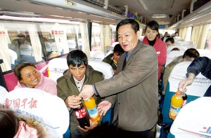 2月10日,6辆爱心包车满载着270名务工人员,发往全州、桂林、博白等方向。今年,《南国早报》与广西运德集团继续联手推出“爱心车票”大型公益活动,当天是爱心包车发送的首批务工人员。图为在爱心包车上,广西日报传媒集团党委书记、董事长,广西日报社社长李启瑞为务工人员送上饮品作为新年祝福。记者 何定坚摄(来源:广西新闻网-南国早报)