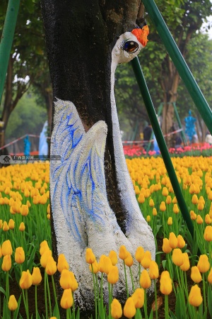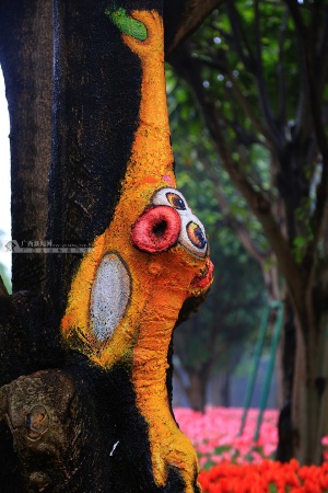 广西新闻网南宁2月11日讯(记者 黄河畅 实习生 周子君)2月11日上午,南宁青秀山公园中国-东盟博览园的郁金香花展吸引了许多区内外游客。公园管理方还在花展周围的树上,依树的形状、结巴、纹理等绘制出动物的图案,惟妙惟肖的图案引得游人纷纷驻足欣赏。