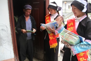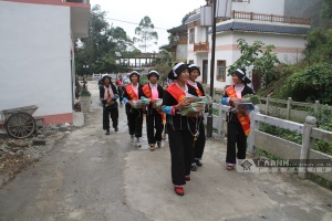 “瑶寨女子志愿消防队”的志愿者进村挨家挨户为村民发放宣传资料。通讯员 陈姿摄