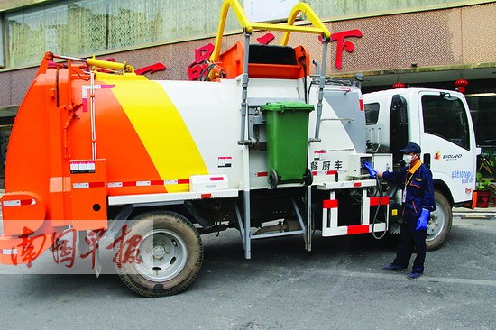 2月28日上午,记者随南宁市餐厨废弃物处理厂的收运车来到鲁班路上的一家餐馆。工人从餐馆里推出一只垃圾桶,熟练地将桶挂在车厢右侧的升降机上,按动开关后,升降机自动把桶升到车厢顶部的收集口并倾倒,然后自动降回地面。工人又从车身上抽出一根水管,将垃圾桶内壁冲洗一番,再倾倒一次后才推回餐馆里,整个过程不到5分钟。