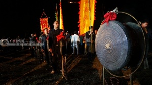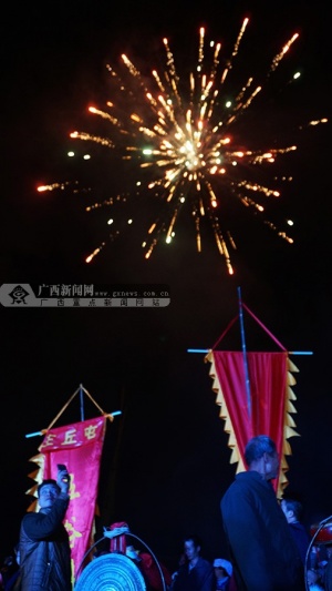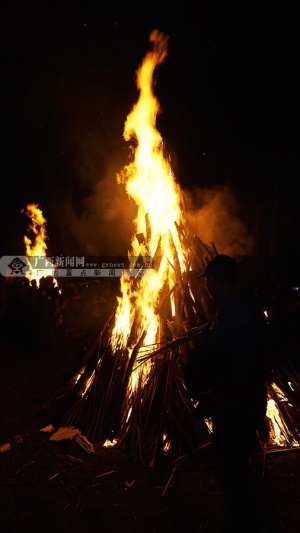 村民将10面幡旗对应安插在每个篝火堆旁,又将四面铜鼓分别安放在主演场地四角;每个篝火堆旁站20至50名身着民族服装演员,他们手中高举火把环绕篝火堆走,时刻准备点燃篝火。主持人宣布点火一刹那,10堆篝火如同火焰山一般熊熊燃烧,火光冲天。熊熊烈火点燃了上万名观众的激情,晚会现场敲铜鼓声、吹管号声连成一片,响彻云霄,男女老少围着篝火,随着旋律又唱又跳,尽情狂欢,祀求来年幸福安康。