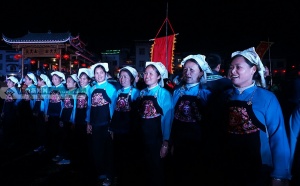 穿着民族特色服装的村民妇女手拉着手唱起民族歌谣。记者 刘洋 摄