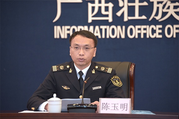 广西海事局宣传处处长陈玉明主持新闻发布会。图片来源:广西壮族自治区人民政府门户网