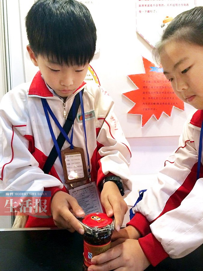 用这个夹很容易开瓶 这些小创意还挺实用 仿制核桃夹,开盖“老干妈”很容易 生活中我们会接触各种瓶瓶罐罐,就拿大家喜欢吃的佐料来说,例如“老干妈”类的佐料,味道虽美,但它装在玻璃螺口瓶内,想要打开瓶盖品尝美味还需要一番“手力”。要是长时间放置在冰箱里再打开就更费劲。 “我有办法能迅速不费力打开它。”中央民族大学附中北海国际学校四年级学生李侗璂拿出一把大夹子,架在螺口瓶盖上轻轻一扭,瓶盖就打开了。“这把夹子是仿造核桃夹的构造打造的,开瓶盖省时省力。”李侗璂笑着说道。