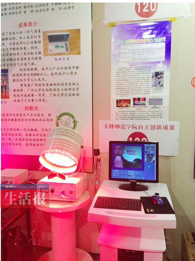 这是3D-LED阵列冷光源的肿瘤光动力、光热治疗仪 治疗仪 可治疗肝癌、乳腺癌 在玉林师范学院的展台上,一台像台灯一样的新产品也吸引着大家目光。 这不是什么台灯,而是治疗癌症新设备,叫3D-LED阵列冷光源的肿瘤光动力、光热治疗仪。据介绍,该治疗仪通过照射被肿瘤组织或细胞靶向洗手的光敏剂、光热剂纳米粒子,借助光动力反应、吸光发热效应,能快速选择性清楚扩散或术中瘤腔附近残存的肿瘤细胞。由于治疗过程基于特异性的靶向定位效应,可以选择特定波长的LED冷光源,同时照射大面积的肿瘤组织,降低肿瘤的复发率。 玉林师范学院聂国朝教授向记者介绍,该治疗仪可用于治疗肝癌、乳腺癌等肿瘤。通过纳米跟踪技术,可裸眼观察肿瘤侵润的范围,确保准确切除肿瘤,避免切除正常组织。此项技术已申请乳腺癌的早期影像振荡(光子振荡)、光动力治疗、X线深层肿瘤治疗等6项专利,且这项技术现已申请注册批文,很快就可以批量生产。