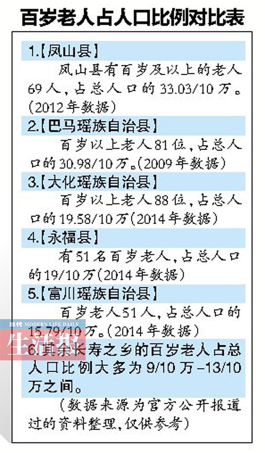 一个发现 5个瑶族自治县中 有4个是长寿之乡 在广西20个长寿之乡名单中,记者注意到一个现象,广西有70多个县,瑶族自治县一共有5个,包括巴马、恭城、富川、大化和都安。其中,巴马、恭城、富川、大化4个瑶族自治县均获得了长寿之乡称号,而唯一一个还没有成为长寿之乡的都安瑶族自治县,近期也在向“中国长寿之乡”的道路上迈步。 记者从都安瑶族自治县了解到,2014年8月25日,都安瑶族自治县启动申报“中国长寿之乡”工作,据都安瑶族自治县自评材料,2014年都安全县存活实足百岁及以上老人156人,每10万人中有22位百岁老人;80岁及以上老年人占60岁及以上老年人的比例为15%。百岁老人占总人口比率和人口长寿比率这两项基本指标均已达标。如果不久的将来,都安也如愿成为长寿之乡,那么,广西所有瑶族自治县有望全部成为长寿之乡。 一个现象 红水河流域长寿之乡“最多” 在广西20个长寿之乡中,还有一个奇特的现象,那就是红水河流域沿线的县份十分突出;在红水河流经广西的10多个县中,巴马、凤山、东兰、宜州、大化都已成为长寿之乡,占红水河流域流经县份的一半,而红水河流域重要的一个县份——马山县早于2014年启动申报工作。 2015年5月18日,记者在中国老年学和老年医学学会官网上,看到了马山县已符合“第二届中国长寿之乡”认证条件,进行正式公告。这意味着,马山县离颁发“中国长寿之乡”的牌匾已指日可待。另外,记者也看到,龙州县的"中国长寿之乡"申报工作已于6月19日获得了认证公告。如果马山、龙州再获长寿之乡牌匾,广西的长寿之乡数量将达到22个。
