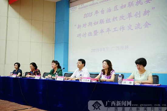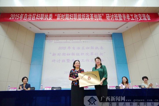 广西新闻网南宁9月8日讯(通讯员 覃毅卉 曾馨慧)9月6日,由自治区妇联主办,广西师范大学承办的2015年自治区妇联执委“新时期妇联组织改革创新”研讨班在广西师范大学开班。开班仪式上,自治区妇联向广西师范大学授予“广西妇女/性别研究与培训基地”牌匾。