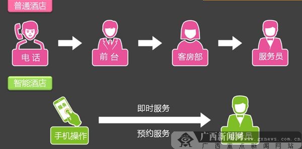 得益于覆盖酒店全区域的360度无缝wifi网络,为手机下载酒店APP提供了便利。 手机APP是玩转智能酒店的一把钥匙,通过APP控制客房内的灯光、空调温度及电子设备;让手机与房间里的电视进行多屏互动,把手机里储存好的音乐、视频传到电视机的大屏幕上,享受更好的视听体验;APP还把酒店内的所有人联系到一起,形成一个大的平台,像社交软件那样和周边的人交友聊天。过去客户需要客房服务要经过三个步骤,客户电话通知大堂,大堂转达至相关的部门,部门再指派工作人员。现在客户有什么需求,在APP上可点对点地直接联系到相关的工作人员上门服务,省掉了中转的环节。