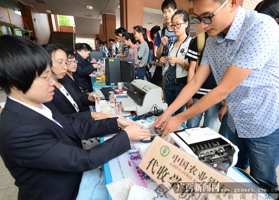 广西新闻网桂林9月16日讯(通讯员 伍文悄)近日,随着高校新生入学季开始,农行桂林分行以代收学费为切入点加大服务力度,从机关和支行抽调了60多人深入到全市6所高校8个校区代收学费。以高科技无线POS刷卡为主,解决了新生携带现金的不便和安全隐患,受到师生欢迎。