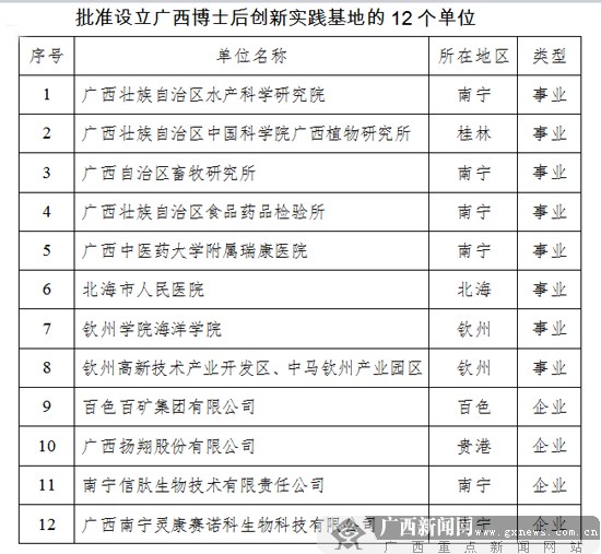 广西新闻网南宁9月24日讯(通讯员戚海军)9月24日,自治区人力资源和社会保障厅向媒体通报,为进一步加大高层次人才引进力度,增强企事业单位技术创新能力和核心竞争力,促进产学研相结合,该厅决定批准广西壮族自治区水产科学研究院等12个单位设立广西博士后创新实践基地(以下简称“基地”)。基地建立自治区、市、基地三级管理体制,自治区人社厅负责基地建立的审批和组织指导、检查督促工作,为基地单位提供人才、项目供需信息,给予政策上的支持;各市人社部门负责对本地基地进行监督管理和跟踪服务工作;基地制定管理规章制度和研发项目实施规划。