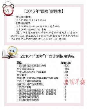 近日,中央组织部、人社部和国家公务员局联合发布《中央机关及其直属机构2016年度考试录用公务员公告》,标志着2016年国考工作正式启动。其中分布在广西的招录职位有552个,招录人数达900人,再创历年新高。国考报名时间为10月15日至24日,公共科目笔试将于11月29日进行。(广西新闻网-当代生活报)