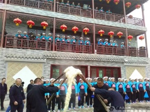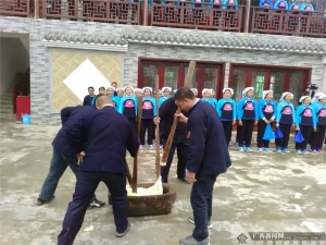 打糍粑,几名壮汉挽袖叉腰甩开膀子,对着大盆子中的糯米舂捣起来,现场做了糯米粑给游客们品尝;哭嫁、跨火盆,父母对出嫁的女儿千叮万嘱,最后接亲场面欢天喜地,给现场的游客朋友分发红蛋,寓意大家一起高高兴兴。