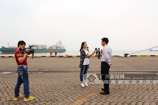 广西新闻网全媒体报道组在采访钦州市港口(集团)有限责任公司总经理助理蒋华军。广西新闻网全媒体报道组摄