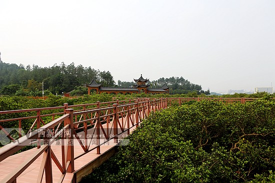 “七十二泾入口处,孙中山在红树林与海水间,坐观风起云涌。”当记者走进位于七十二泾旅游景区内的仙岛公园,便着实产生了这样的感觉。在公园里,穿梭在海榄树上木栈道,可供游人能近距离接触红树林,置身蓝海绿林中感受候鸟居迁,很好的营造出了一种人与自然的和谐氛围。据景区的工作人员介绍,仙岛公园是钦州港的地标,是开发区推进生态旅游发展的重头戏。2015年,钦州港经济技术开发区计划投资约1350万元,分两期对仙岛公园开展大刀阔斧的改、扩、建项目。仙岛公园全新规划定位后,已然蜕化成一座集生态、文化、休闲、科普为一体的主题文化公园,深受广大游客青睐。