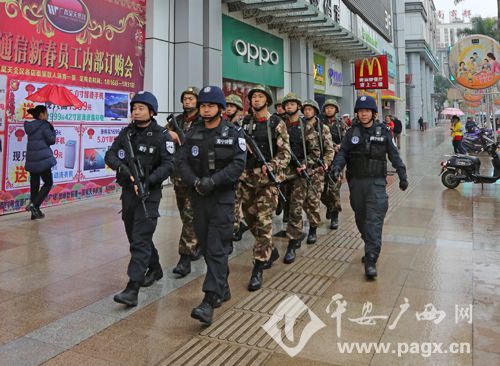 特警和武警在南宁市街头联合武装巡逻。通讯员 黎克平 摄