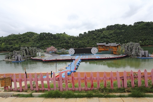赐福湖“梦·巴马”舞台,背景是秀丽青山。广西新闻网红豆社区网友 黄天福摄