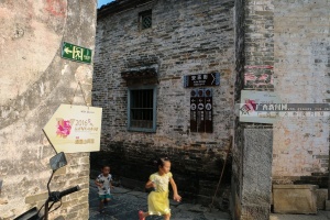古镇的指示牌,还有奔跑的小孩。广西新闻网记者 唐沛尧 摄