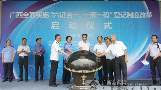 广西新闻网南宁9月30日讯(记者 李冠宏)为进一步推动简政放权向纵深发展,更好激发市场活力和社会创造力,深入推进商事制度改革,在全面实施企业“三证合一”的基础上,进一步整合社会保险登记证、统计登记证,实现“五证合一、一照一码”。为推动“五证合一”改革早日在广西落地,自治区工商局依托自治区商事制度改革部门联席会议的平台,提前谋划,周密部署,创新性地将公安部门的企业印章准刻证纳入“五证合一”商事制度改革,扩展为“六证合一”。