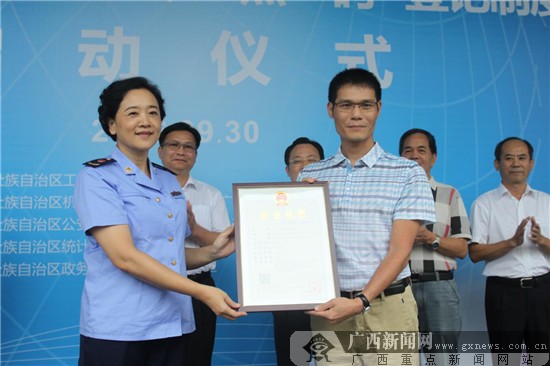 自治区工商局局长张虹向企业发放了“六证合一、一照一码”营业执照。广西新闻网记者 李冠宏摄